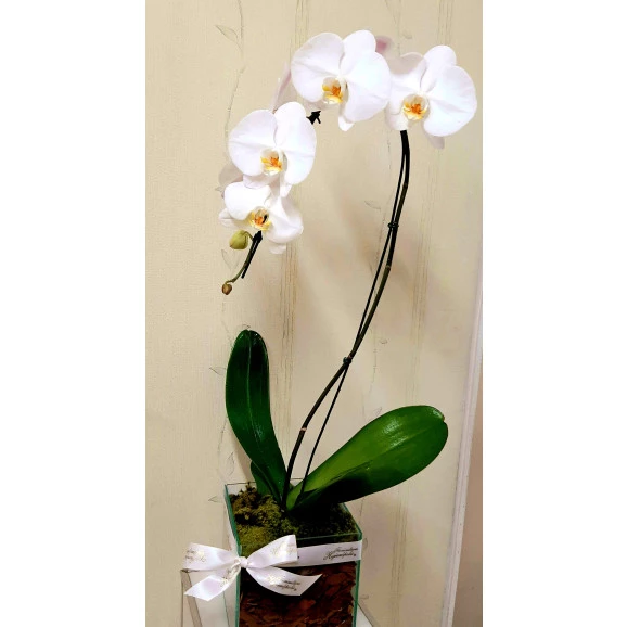 Linda orquidea Phalaenopsis branca cascata em caxepô de vidro.